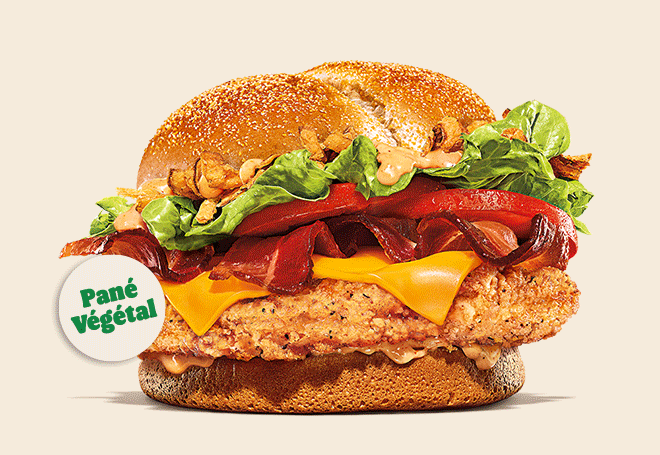 Sa sauce épicée façon cajun, ses oignons croustillants, son cheddar fondu, ses fines tranches de bacon végétal La Vie® et son pané croustillant végétal...